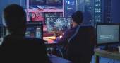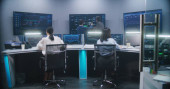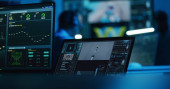 Afroamerykanin w słuchawkach monitoruje misję kosmiczną na komputerze z wieloma monitorami w centrum dowodzenia. Zespół klaskać ręce po udanym uruchomieniu rakiety kosmicznej wyświetlane na dużych ekranach.