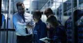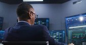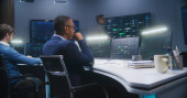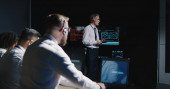 Specjaliści ds. pomocy technicznej siedzą przy komputerach z wyświetlaną mapą sieci blockchain i danymi serwera. Wielcy naukowcy pracują w pokoju monitoringu. Duże ekrany na ścianie. Pojęcie bezpieczeństwa cybernetycznego.