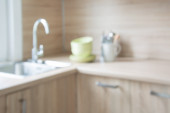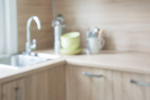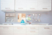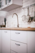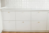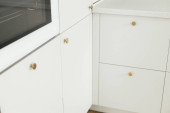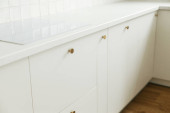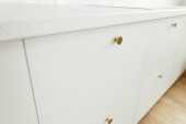 Zdjęcie "Nowoczesne wnętrze kuchni. Stylowe białe szafki kuchenne z mosiężnymi gałkami zamykają się w nowym skandynawskim domu. Sprzątanie szafy. Nowoczesny minimalistyczny design kuchni. Przechowywanie" może być wykorzystywane do celów osobistych i komercyjnych zgodnie z warunkami zakupionej licencji Royalty-free. Obraz jest dostępny do pobrania w jakości wysokiej rozdzielczości do 5760x3840.