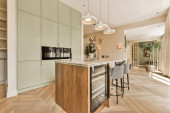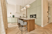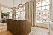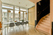 Zdjęcie "jadalnia z drewnianą podłogą i białymi tapetami na ścianach znajduje się duży drewniany stół otoczony czarnymi krzesłami" może być wykorzystywane do celów osobistych i komercyjnych zgodnie z warunkami zakupionej licencji Royalty-free. Obraz jest dostępny do pobrania w jakości wysokiej rozdzielczości do 5760x3840.