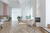 Zdjęcie "jadalnia z drewnianą podłogą i białe ściany, otwarte drzwi do salonu jest w tle" może być wykorzystywane do celów osobistych i komercyjnych zgodnie z warunkami zakupionej licencji Royalty-free. Obraz jest dostępny do pobrania w jakości wysokiej rozdzielczości do 5760x3840.