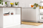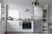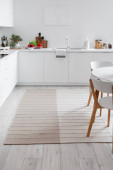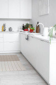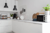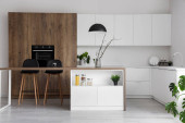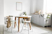 Wnętrze nowoczesnej kuchni ze stołem na wyspie i białymi licznikami