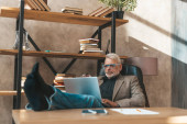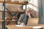 Sprawozdania finansowe i statystyki. Skoncentrowany starszy pan pracujący nad laptopem w domu w kuchni. Szkolenie zdalne dla dorosłych.