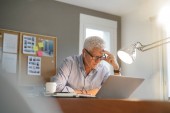 Zdjęcie "Sprawozdania finansowe i statystyki. Skoncentrowany starszy pan pracujący nad laptopem w domu w kuchni. Szkolenie zdalne dla dorosłych." może być wykorzystywane do celów osobistych i komercyjnych zgodnie z warunkami zakupionej licencji Royalty-free. Obraz jest dostępny do pobrania w jakości wysokiej rozdzielczości do 5760x3840.