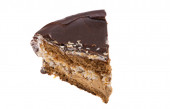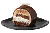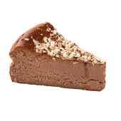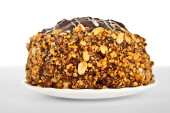 Ciasto czekoladowe. Malaga ciasto z bananem wewnątrz, czekolady i orzechów laskowych na zewnątrz izolowane na białym tle. zbliżenie