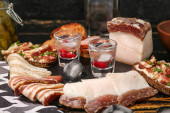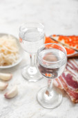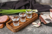 Szoty z zimną wódką i przekąskami na drewnianym tle
