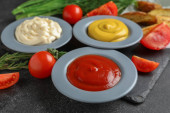 Talerze z różnymi sosami i ziołami na drewnianym stole