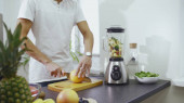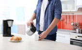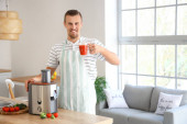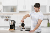 Młody człowiek robi tosty ze smacznym masłem orzechowym w kuchni