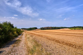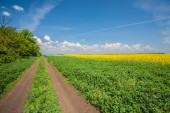 krajobraz wiejski z polną drogą i kwitnącą rzepą wiosną w Polsce