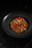 Smażone krewetki na talerzu z warzywami na czarnym tle z odbiciem. menu restauracja.