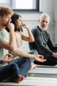 młoda Afroamerykanka medytująca z zamkniętymi oczami w pobliżu wielonarodowych przyjaciół relaksujących się w łatwej pozie podczas zajęć jogi, harmonii i koncepcji wellness