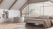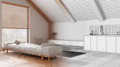 Zdjęcie "Japandi ciemny drewniany salon i kuchnia z pochyłym sufitem i parkiet w odcieniach bieli. Tkanina sofa i szafki. Japoński skandynawski styl, poddasze wnętrza" może być wykorzystywane do celów osobistych i komercyjnych zgodnie z warunkami zakupionej licencji Royalty-free. Obraz jest dostępny do pobrania w jakości wysokiej rozdzielczości do 5760x3840.