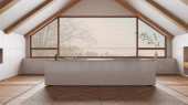 Japoński drewniany salon i kuchnia z pochyłym sufitem i parkiet w odcieniach bieli i fioletu. Tkanina sofa i szafki. Japoński skandynawski styl, poddasze wnętrza