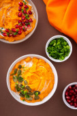 Healthy lunches, delicious pumpkin cream soup with sunflower and pumpkin seeds, sesame and flax and with coconut milk, mix salad, top view