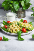 Zdjęcie "Gofry cukiniowe z rukolą i pomidorami wiśniowymi w talerzu" może być wykorzystywane do celów osobistych i komercyjnych zgodnie z warunkami zakupionej licencji Royalty-free. Obraz jest dostępny do pobrania w jakości wysokiej rozdzielczości do 5760x3840.