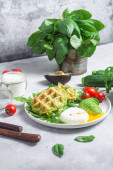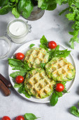 Gofry cukiniowe z rukolą i pomidorami wiśniowymi w talerzu