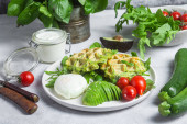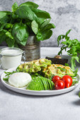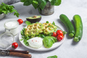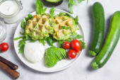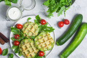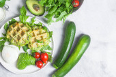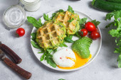 Wafle cukiniowe, gotowane jajka, awokado i pomidory wiśniowe w talerzu