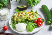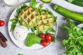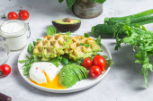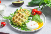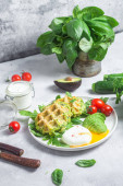 Wafle cukiniowe, gotowane jajka, awokado i pomidory wiśniowe w talerzu