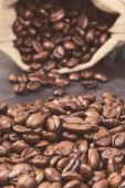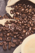 Biały szklany kubek kawy i palone ciemno pachnące ziarna kawy w jałowej torbie