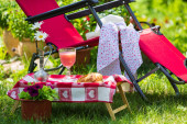 Leżak dla relaksu i kapelusz stoi w ogrodzie na zielonej trawie