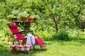 Zdjęcie "Leżak dla relaksu i kapelusz stoi w ogrodzie na zielonej trawie" może być wykorzystywane do celów osobistych i komercyjnych zgodnie z warunkami zakupionej licencji Royalty-free. Obraz jest dostępny do pobrania w jakości wysokiej rozdzielczości do 5760x3840.