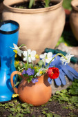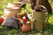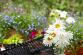 doniczki z kwiatami na stole w ogrodzie w słoneczny dzień