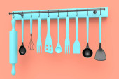 Zestaw naczyń kuchennych, garnek, patelnia i chromowane naczynia wiszące na półce na pomarańczowym tle. 3d renderowania procesu gotowania krok po kroku i akcesoria do gotowania, mieszania i mieszania
