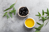 Czarne oliwki i oliwa z oliwek z pierwszego tłoczenia w małej misce z gałązkami drzew oliwnych widok z góry na szary beton kamienne tło, miejsce na tekst