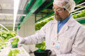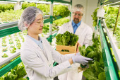 Zdjęcie "Młoda kobieta naukowiec robi notatki w dokumencie, stojąc naprzeciw kolegi trzymając kilka zielonych szpinaku w pionowym gospodarstwie" może być wykorzystywane do celów osobistych i komercyjnych zgodnie z warunkami zakupionej licencji Royalty-free. Obraz jest dostępny do pobrania w jakości wysokiej rozdzielczości do 5760x3840.