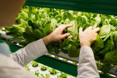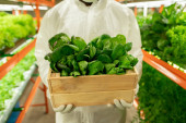 Dojrzały inżynier agro w ochronnym pudełku na ubrania robocze z zielonymi liśćmi szpinaku i patrząc w kamerę poruszając się wzdłuż kratownic