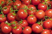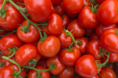 Surowe pomidory wiśniowe Ornela tło makro. Tekstura małych pomidorów w kształcie butelki. Dojrzałe warzywa organiczne zbliżenie. Zdrowe jedzenie wegetariański składnik żywności. Koncepcja zbiorów. Widok z góry.