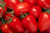 Zdjęcie "Surowe pomidory wiśniowe Ornela tło makro. Tekstura małych pomidorów w kształcie butelki. Dojrzałe warzywa organiczne zbliżenie. Zdrowe jedzenie wegetariański składnik żywności. Koncepcja zbiorów. Widok z góry." może być wykorzystywane do celów osobistych i komercyjnych zgodnie z warunkami zakupionej licencji Royalty-free. Obraz jest dostępny do pobrania w jakości wysokiej rozdzielczości do 5760x3840.