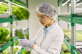 Młoda kobieta naukowiec z pipetą i szalką Petriego studiuje zielony szpinak i inne rośliny podczas podejmowania maleńki kawałek liścia podczas eksperymentu