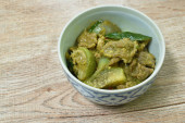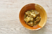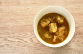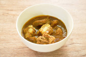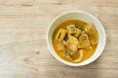 pikantna smażona kość wieprzowa z ziołem w sosie curry na misce