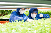 Dwóch inżynierów agro w maskach ochronnych badających nowe rodzaje sałaty lub innych warzyw liściastych, podczas gdy człowiek bierze małe liście zielonych sadzonek