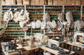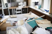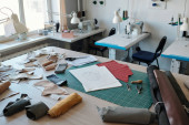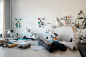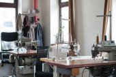 Skupianie się na miejscach pracy szwaczek lub garbarzy ze sprzętem elektrycznym, lampami i kolorowymi szpuletami nici na ścianie w warsztacie
