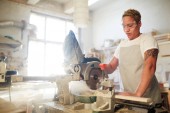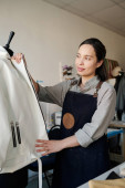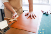 Zbliżenie dojrzałego profesjonalnego krawca z kawałkiem skóry, zamszu lub innego materiału włókienniczego w kolorze żółtym w dłoniach stojących przy miejscu pracy w studio