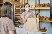 Młoda poważna kobieta w beżowym fartuchu bawełnianym biorąca świeży chleb z wystawy podczas obsługi klientów piekarni lub stołówki
