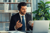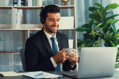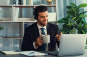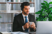 Manager biura operatora call center siedzi na biurku z kawą podczas pracy na laptopie. Pracownik biurowy noszący słuchawki i czarny garnitur pracujący nad obsługą klienta lub telemarketingiem. żarliwy