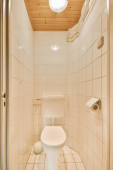 Zdjęcie "biała toaleta i umywalka w małej łazience z beżowymi płytkami na ścianach, nad nią znajduje się lustro" może być wykorzystywane do celów osobistych i komercyjnych zgodnie z warunkami zakupionej licencji Royalty-free. Obraz jest dostępny do pobrania w jakości wysokiej rozdzielczości do 5760x3840.