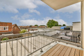 balkon z drzewami i budynkami w tle, zabrany z okna apartamentu z widokiem na ulicę poniżej