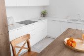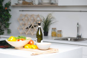 Drewniany stół na wyspie ze świeżymi warzywami i roślinami w nowoczesnej kuchni