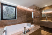 Zdjęcie "łazienka z umywalką i kabiną prysznicową w rogu, przeniesiona z boku do drugiej części pokoju" może być wykorzystywane do celów osobistych i komercyjnych zgodnie z warunkami zakupionej licencji Royalty-free. Obraz jest dostępny do pobrania w jakości wysokiej rozdzielczości do 5760x3840.