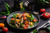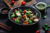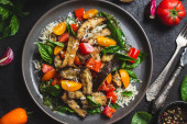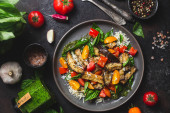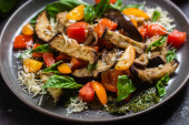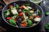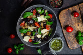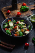 Sałatka bakłażana, bazylia, ser cheddar z pomidorami