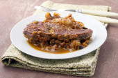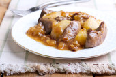Wieprzowina policzki w sosie z karmelizowanego porów i walijski cebula ciasto