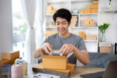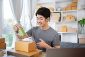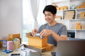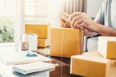 Zdjęcie "Efektywna dostawa w domu, pakowanie przedmiotów człowieka do skrzynki pocztowej dla klientów, Zakupy online i małych przedsiębiorstw przedsiębiorczość, Skrzynka pakująca, Sprzedaj online, Freelance pracy." może być wykorzystywane do celów osobistych i komercyjnych zgodnie z warunkami zakupionej licencji Royalty-free. Obraz jest dostępny do pobrania w jakości wysokiej rozdzielczości do 5760x3840.
