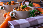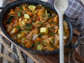 Gulasz z ciecierzycy, słodkie ziemniaki i mięso mielone w garnku
