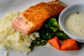sezonowo pieczony łosoś podawany z marchewką i puree ziemniaczane top z ziołami,
