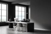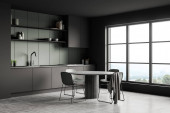 Ciemne wnętrze kuchni z krzesłami i stołem, widok z boku, szara betonowa podłoga. Naczynia i dekoracje, stylowa kuchnia z panoramicznym oknem. Renderowanie 3D