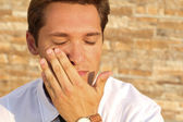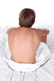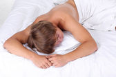 młody facet w białym łóżku rozmowy na telefon komórkowy, emocje